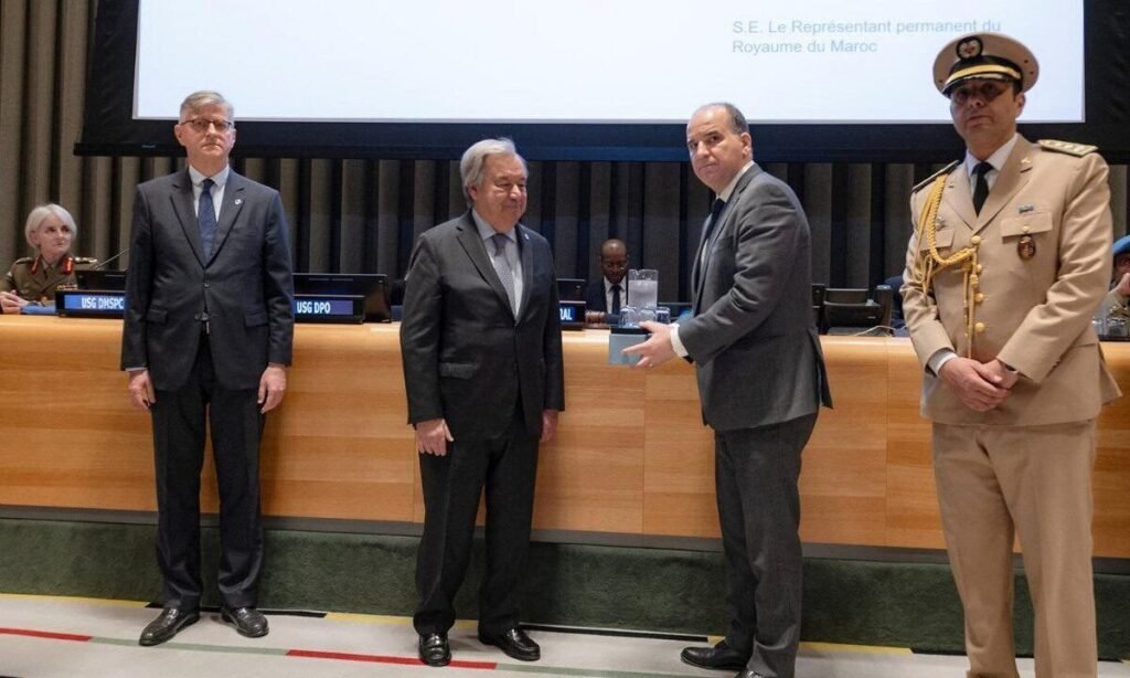 قام الأمين العام لمنظمة الأمم المتحدة، أنطونيو غوتيريش، بتكريم روح جندي من حفظة السلام التابعين للقوات المسلحة الملكية، خلال اللقاء السنوي لتكريم أفراد القبعات الزرق العسكريين والمدنيين الذين لقوا حتفهم خلال عمليات حفظ السلام الأممية، بحضور السفير الممثل الدائم للمغرب لدى الأمم المتحدة، عمر هلال، والمستشار العسكري بالبعثة الدائمة للمملكة لدى الأمم المتحدة، الكولونيل نجيم أسيد.