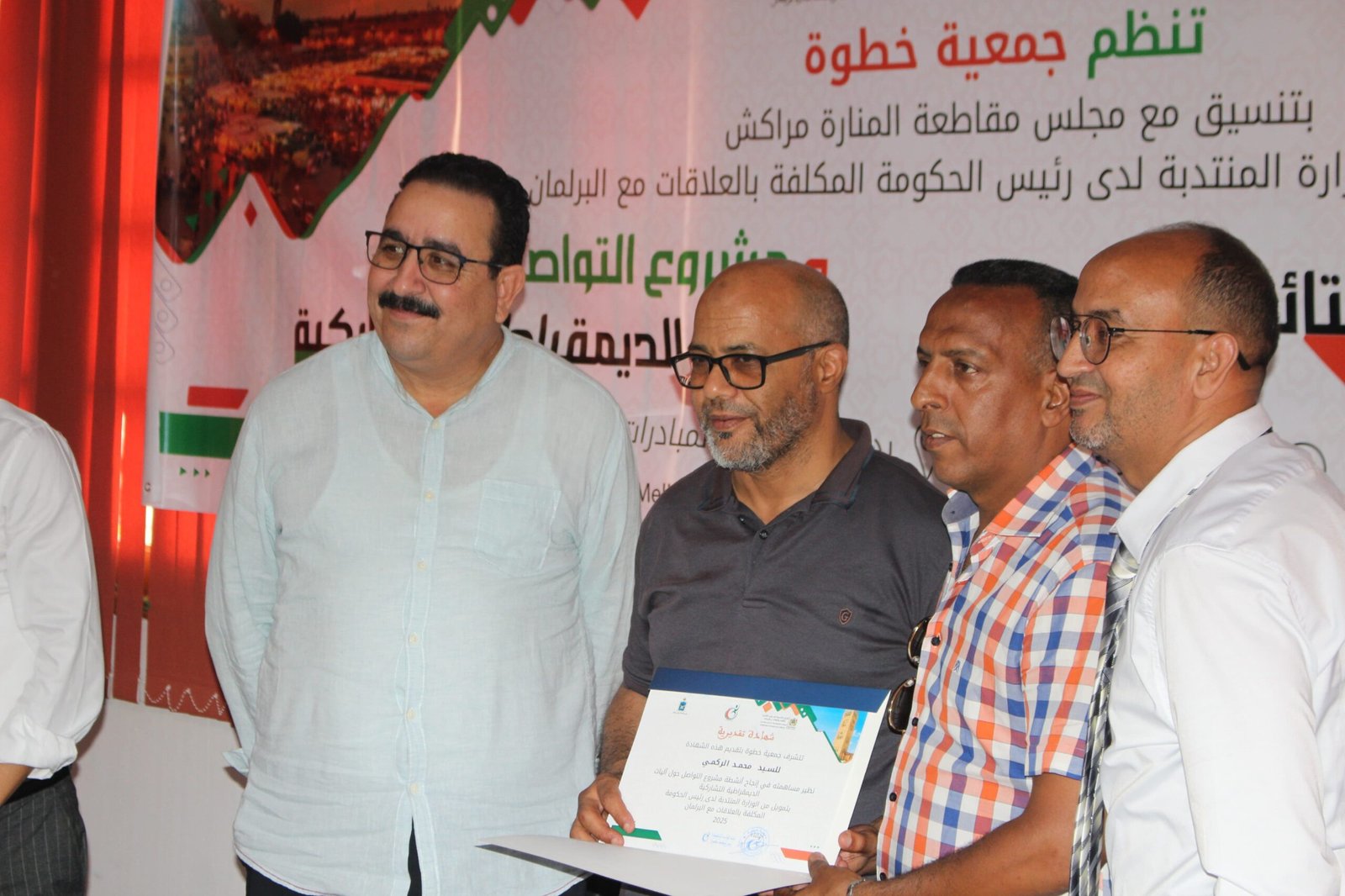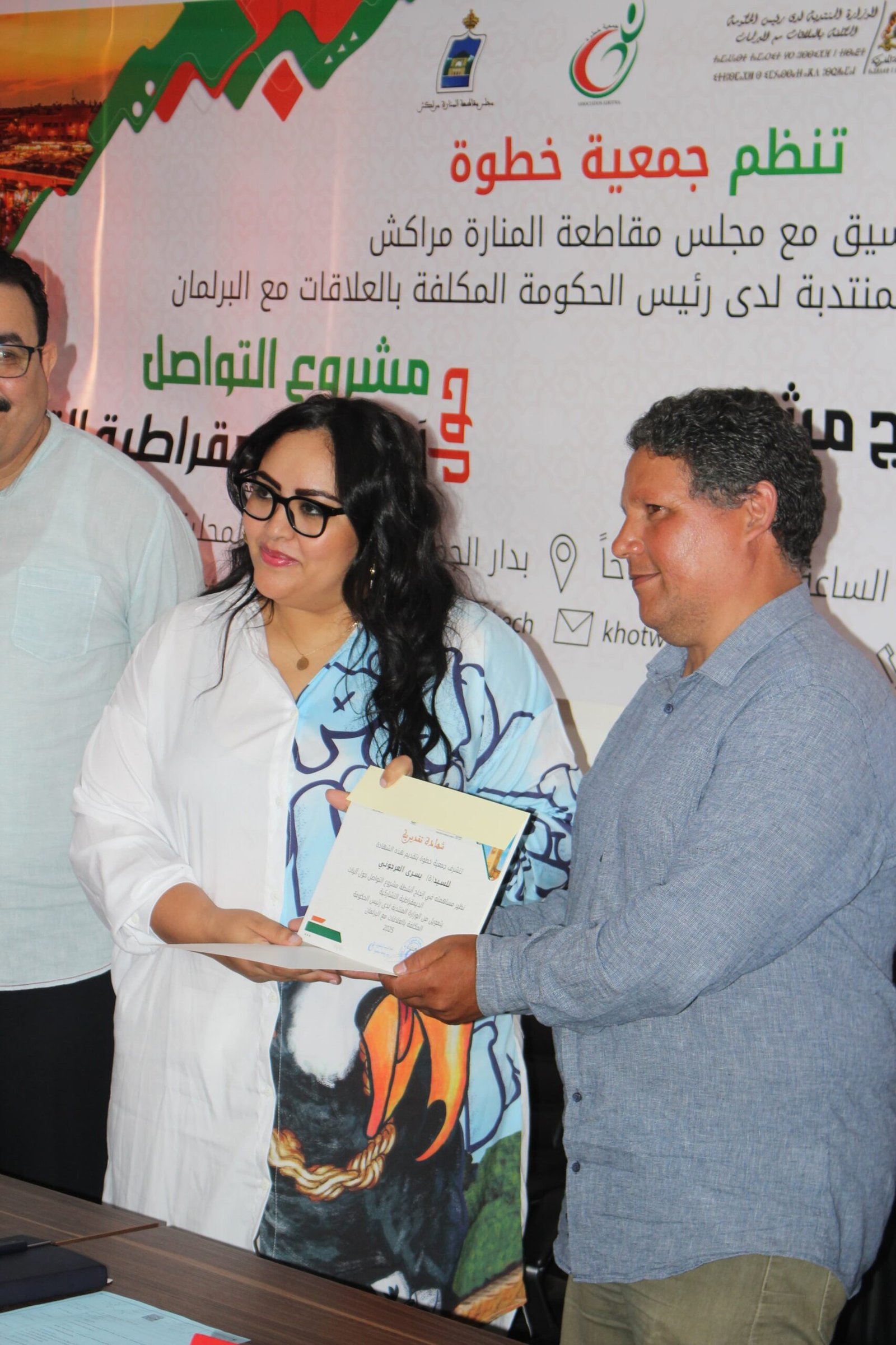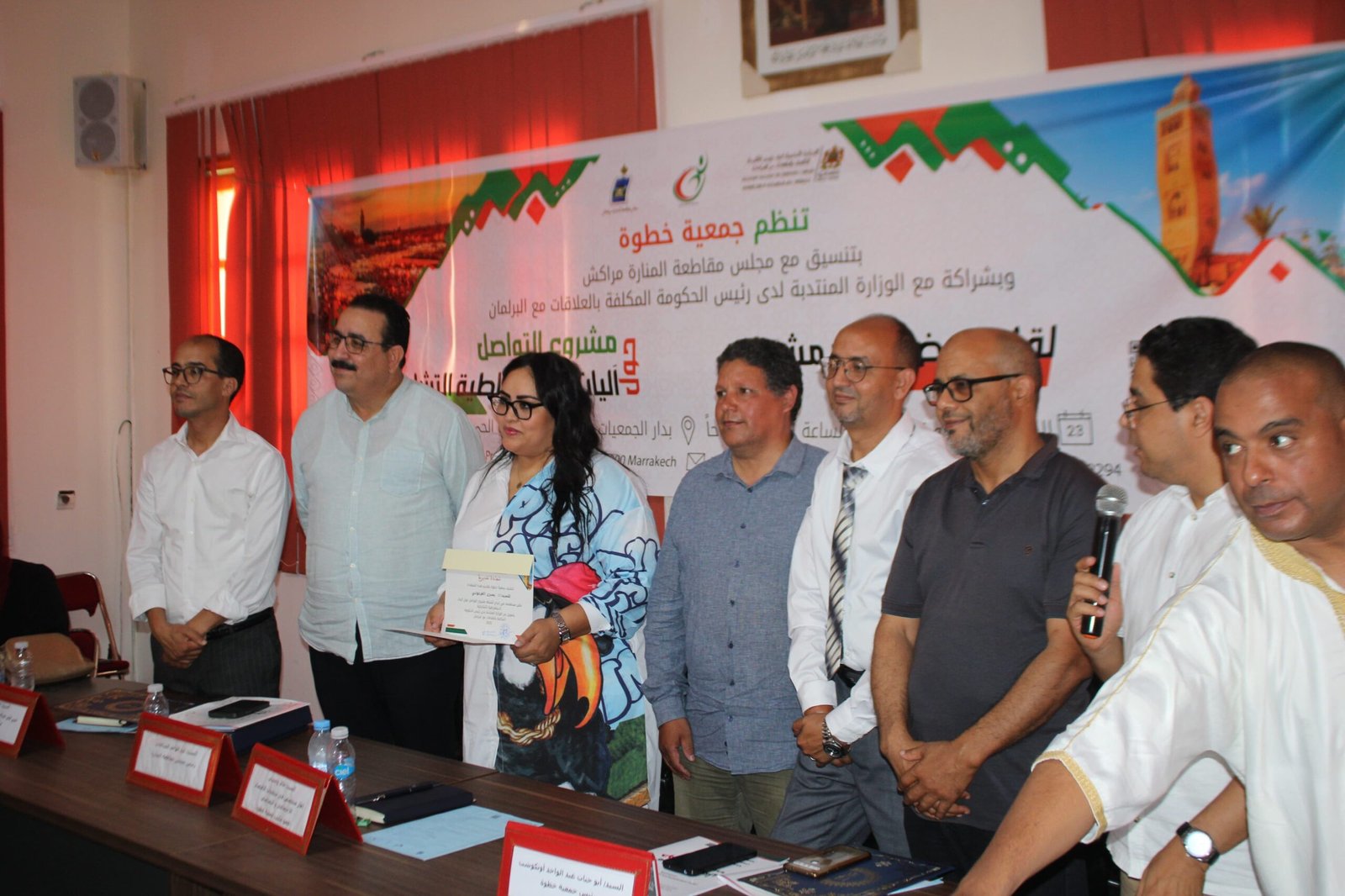و قد تخلل هذا اللقاء، مداخلات كل من السادة رئيس جمعية خطوة عبد الواحد أتكوست، السيد رئيس مقاطعة المنارة النائب البرلماني عبد الواحد الشافقي، السيد ممثل الوزارة المنتدبة لدى رئيس الحكومة المكلفة بالعلاقات مع البرلمان، و السيد ممثل قسم الجماعات الترابية بولاية جهة مراكش آسفي.