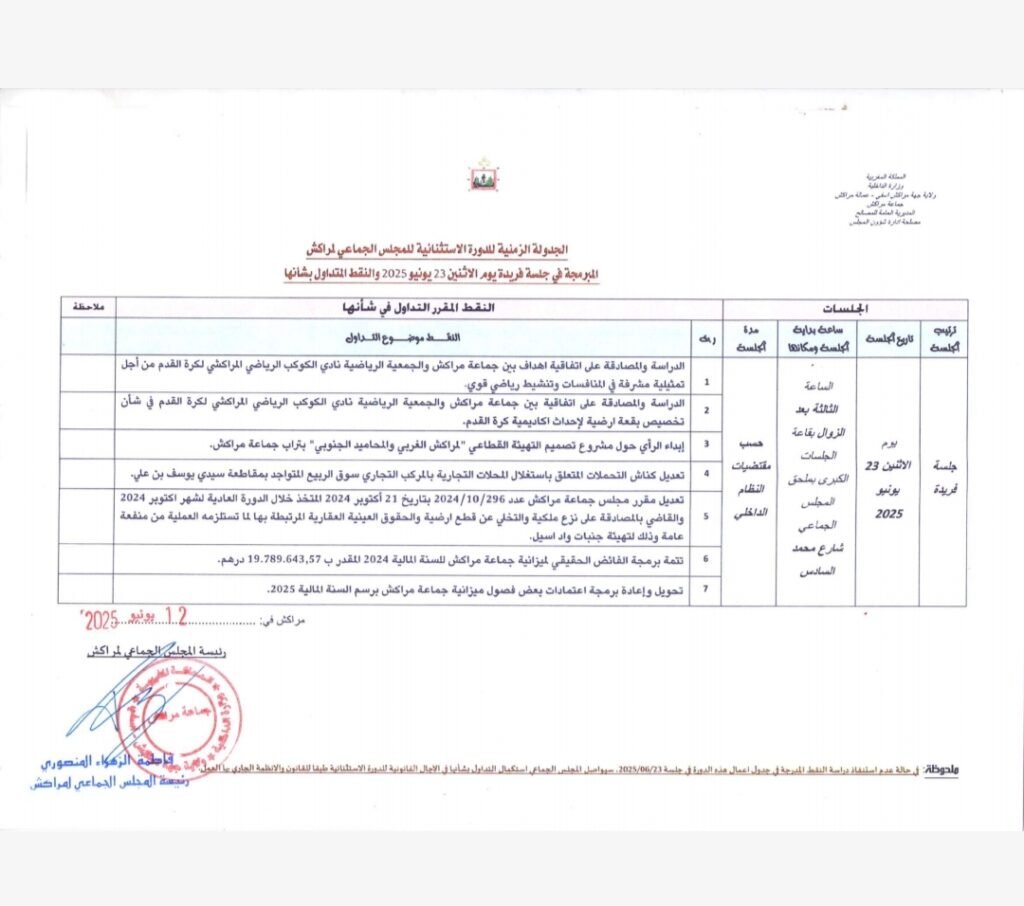 يعقد المجلس الجماعي لمراكش دورة استثنائية في جلسة واحدة، يوم الاثنين 23 يونيو 2025