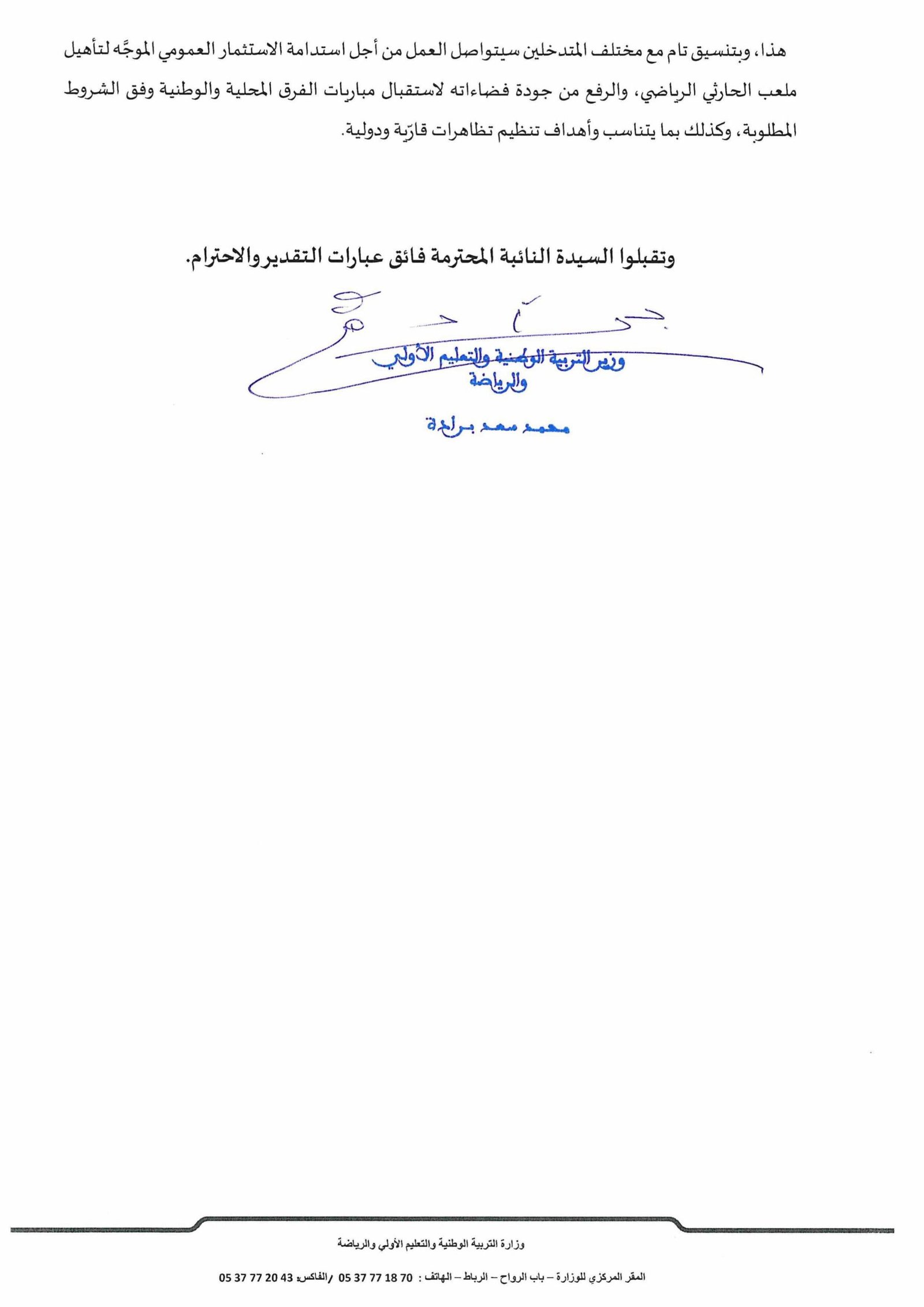الموضوع: الإجراءات الحكومية المتخذة لإعادة فتح ملعب الحارثي أمام فريق الكوكب المراكشي وباقي الأندية المحلية.