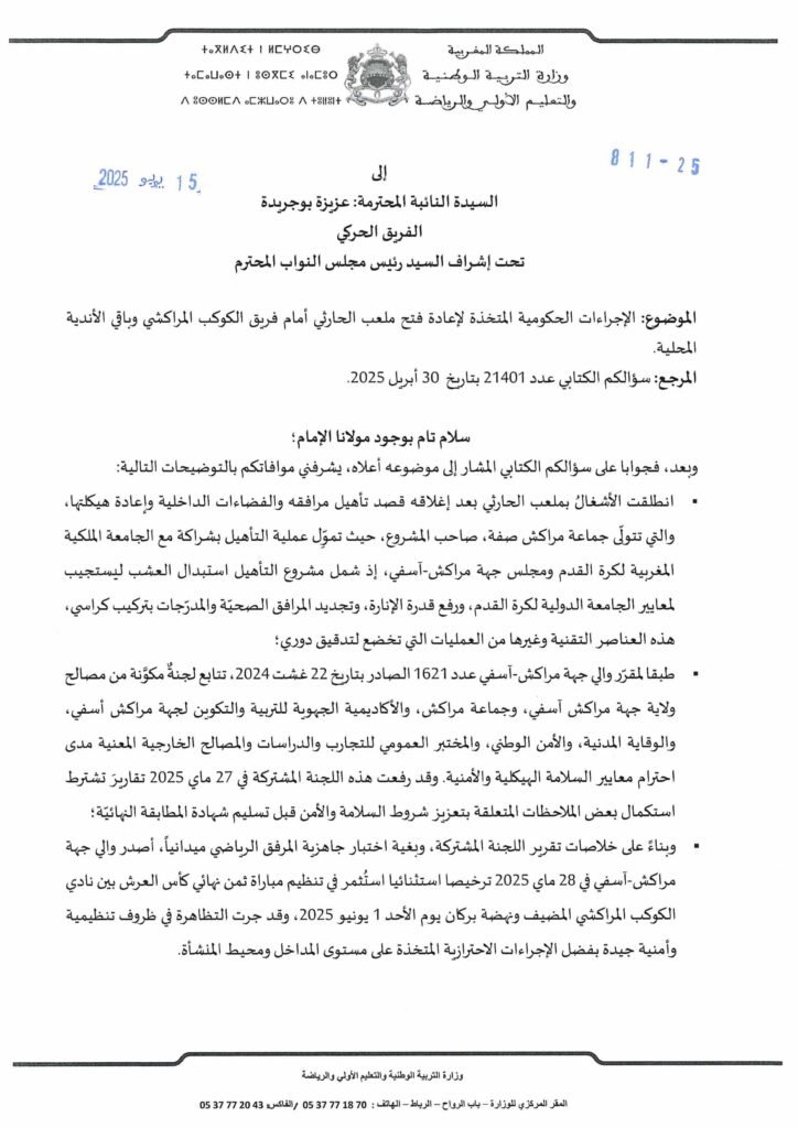 جواب وزير التربية الوطنية و التعليم الأولي و الرياضي على السؤال الكتابي للنائبة البرلمانية عزيزة بوجريدة حول الإجراءات الحكومية لإعادة فتح ملعب الحارثي بمراكش أمام فريق الكوكب المراكشي و باقي الأندية المحلية