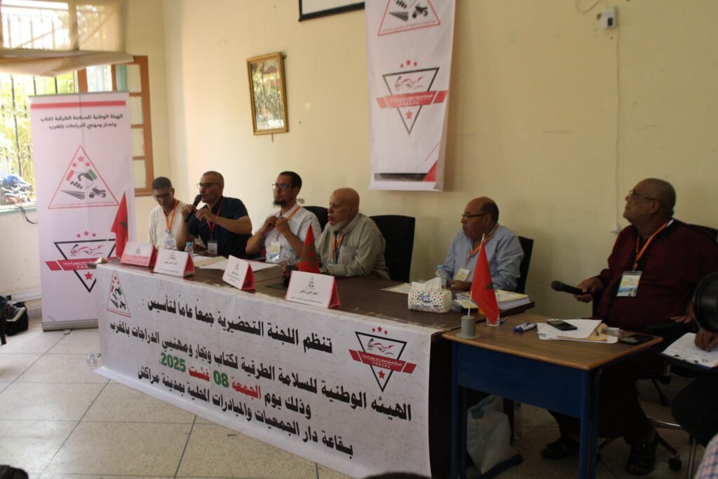 نظمت اللجنة التحضيرية جمعا عاما لتأسيس الهيئة الوطنية للسلامة الطرقية لكتاب و تجار و مهنيي التجار بالمغرب يوم الجمعة 8 غشت 2025، بقاعة دار الجمعيات و المبادرات المحلية بالحي الحسني بمقاطعة المنارة مراكش.