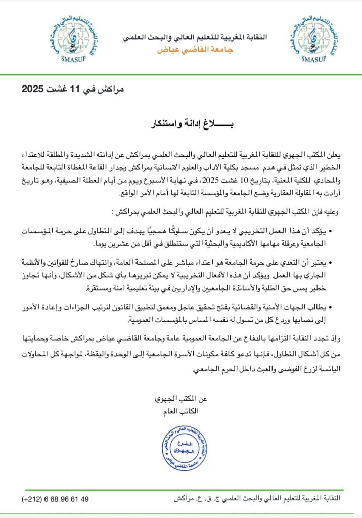 يعلن المكتب الجهوي للنقابة المغربية للتعليم العالي والبحث العلمي بمراكش عن إدانته الشديدة والمطلقة للاعتداء الخطير الذي تمثل في هدم مسجد بكلية الآداب والعلوم الانسانية بمراكش وجدار القاعة المغطاة التابعة للجامعة والمحادي للكلية المعنية، بتاريخ 10 غشت 2025، في نهاية الأسبوع ويوم من أيام العطلة الصيفية، وهو تاريخ أرادت به المقاولة العقارية وضع الجامعة والمؤسسة التابعة لها أمام الأمر الواقع.