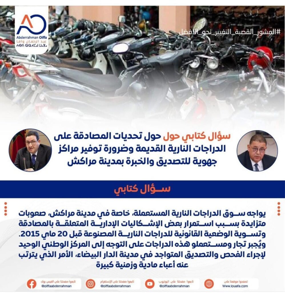 وفي معرض سؤاله قال وافا إن سوق الدراجات النارية المستعملة، خاصة في مدينة مراكش، يواجه صعوبات متزايدة بسبب استمرار بعض الإشكاليات الإدارية المتعلقة بالمصادقة وتسوية الوضعية القانونية للدراجات النارية المصنوعة قبل 20 ماي 2015  حيث يُجبر تجار ومستعملو هذه الدراجات على التوجه إلى المركز الوطني الوحيد لإجراء الفحص والتصديق المتواجد في مدينة الدار البيضاء، الأمر الذي يترتب عنه أعباء مادية وزمنية كبيرة.