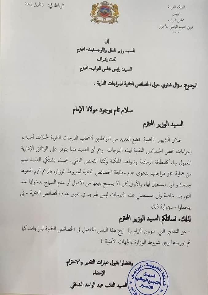 وفي هذا الإطار تبين أن عبد الواحد الشافقي البرلماني عن مقاطعة المنارة سبق أن تقدم بسؤال شفوي، خلال شهر أبريل الماضي، إلى وزير النقل واللوجستيك بخصوص الخصائص التقنية للدراجات النارية .