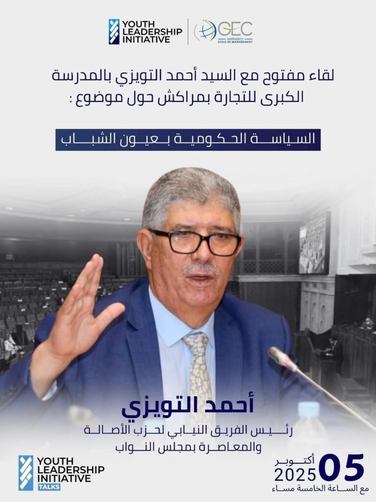 في إطار تعزيز الثقافة الديمقراطية وتمكين الشباب من ممارسة مواطنتهم الفاعلة، تنظم جمعية مبادرة الشباب القادة بشراكة مع المدرسة الكبرى للتجارة بمراكش لقاء مفتوحا مع السيد أحمد تويزي، رئيس الفريق النيابي لحزب الاصالة والمعاصرة بمجلس النواب، حول موضوع: