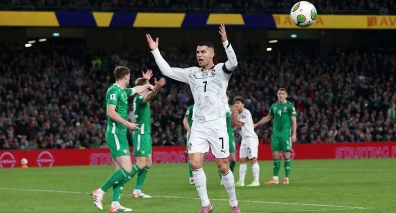 وتلقى رونالدو بطاقة حمراء هي الأولى له مع “برازيل أوروبا”، لاعتدائه بمرفقه على دارا أوشيا مدافع منتخب أيرلندا، في الشوط الثاني من عمر المباراة التي أقيمت في دبلن، مساء الخميس، بالتصفيات الأوروبية المؤهلة للمونديال.