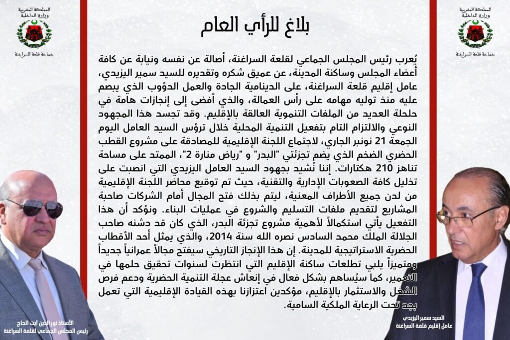 يُعرب رئيس المجلس الجماعي لقلعة السراغنة، أصالة عن نفسه ونيابة عن كافة أعضاء المجلس وساكنة المدينة، عن عميق شكره وتقديره للسيد سمير اليزيدي، عامل إقليم قلعة السراغنة، على الدينامية الجادة والعمل الدؤوب الذي يبصم عليه منذ توليه مهامه على رأس العمالة، والذي أفضى إلى إنجازات هامة في حلحلة العديد من الملفات التنموية العالقة بالإقليم. وقد تجسد هذا المجهود النوعي والالتزام التام بتفعيل التنمية المحلية خلال ترؤس السيد العامل اليوم الجمعة 21 نونبر الجاري، لاجتماع اللجنة الإقليمية للمصادقة على مشروع القطب الحضري الضخم الذي يضم تجزئتي “البدر” و “رياض منارة 2″، الممتد على مساحة تناهز 210 هكتارات. إننا نُشيد بجهود السيد العامل اليزيدي التي انصبت على تذليل كافة الصعوبات الإدارية والتقنية، حيث تم توقيع محاضر اللجنة الإقليمية من لدن جميع الأطراف المعنية، ليتم بذلك فتح المجال أمام الشركات صاحبة المشاريع لتقديم ملفات التسليم والشروع في عمليات البناء. ونؤكد أن هذا التفعيل يأتي استكمالاً لأهمية مشروع تجزئة البدر، الذي كان قد دشنه صاحب الجلالة الملك محمد السادس نصره الله سنة 2014، والذي يمثل أحد الأقطاب الحضرية الاستراتيجية للمدينة. إن هذا الإنجاز التاريخي سيفتح مجالاً عمرانياً جديداً ومتميزاً يلبي تطلعات ساكنة الإقليم التي انتظرت لسنوات تحقيق حلمها في التعمير، كما سيُساهم بشكل فعال في إنعاش عجلة التنمية الحضرية ودعم فرص الشغل والاستثمار بالإقليم، مؤكدين اعتزازنا بهذه القيادة الإقليمية التي تعمل بجد تحت الرعاية الملكية السامية.