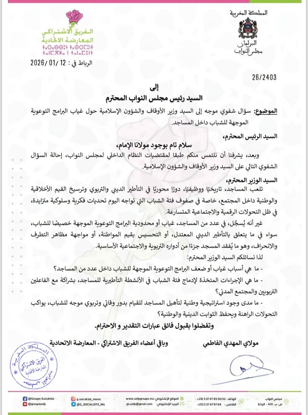 تقدم السيد مولاي المهدي الفاطمي النائب البرلماني عن إقليم الجديدة عن حزب الإتحاد للقوات الشعبية بمجلس النواب، بسؤال شفوي إلى السيد وزير الأوقاف و الشؤون الإسلامية حول موضوع غياب البرامج التوعوية الموجهة للشباب داخل المساجد.