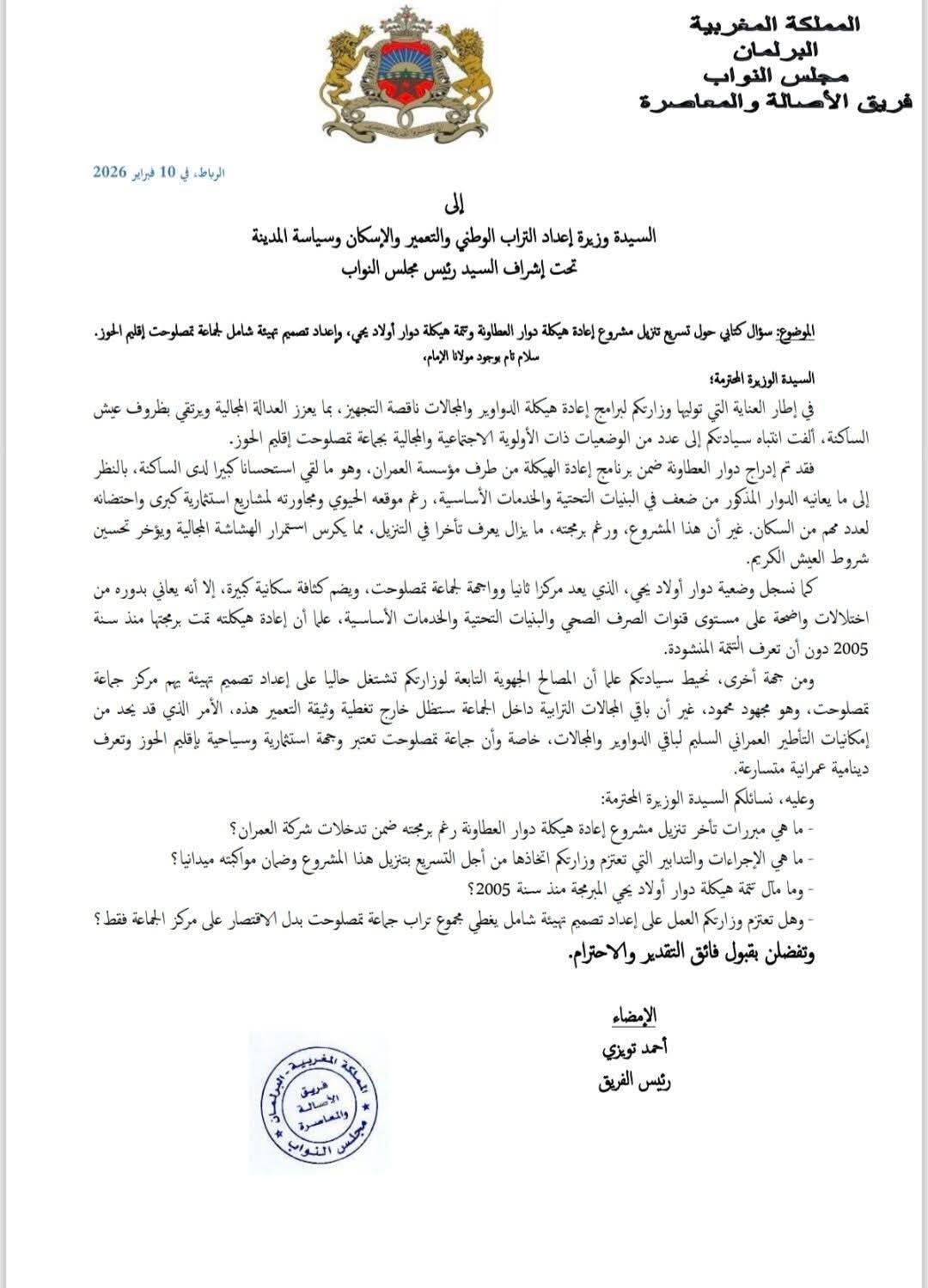 مراكش:تويزي أحمد نائب برلماني عن إقليم الحوز يسائل وزيرة التعمير حول تسريع تهيئة دوار العطاونة و تتمة هيكلة دوار أولاد يحيى و إعادة تصميم تهيئة شامل لجماعة تمصلوحت