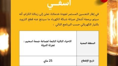 في إطار التحسين المستمر لجودة خدماتنا، نعلن إلى زبنائنا الكرام، أنه سیتم برمجة أشغال صيانة شبكة الكهرباء ما سينتج عنه…